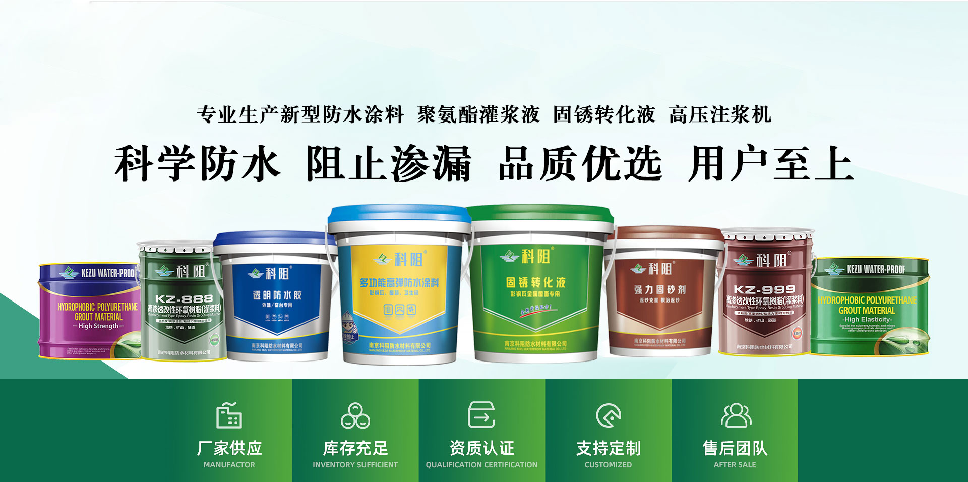 01 科阻品牌堅守20余年,產(chǎn)品種類繁多。防水涂料、鐵銹轉化劑、注漿機等配套一應俱全。